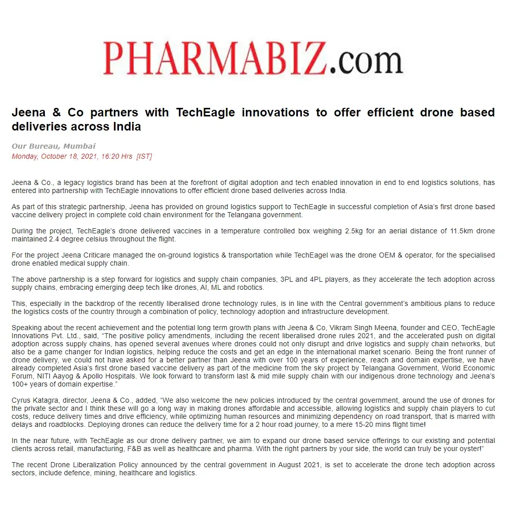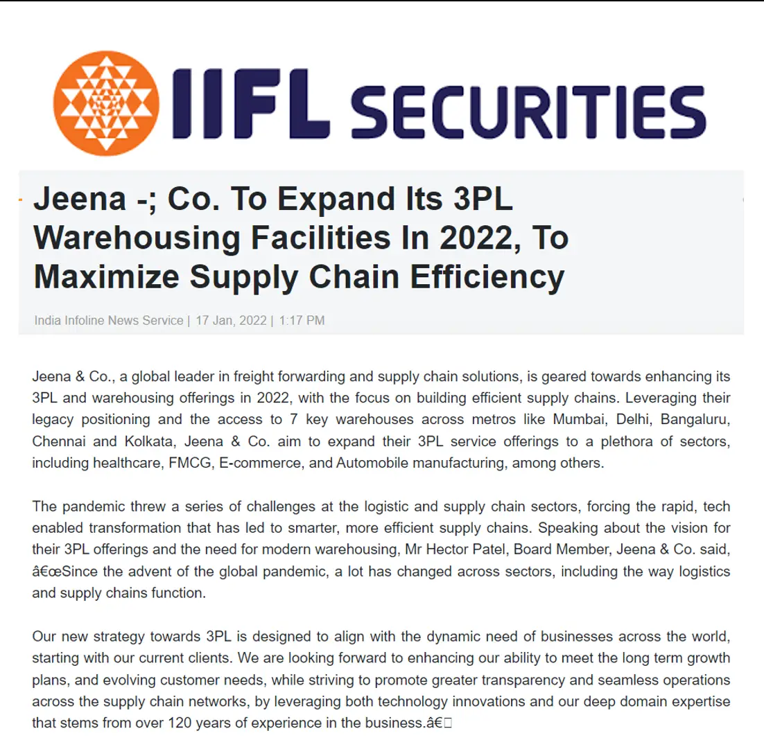 Jeena has been giving transformative logistics solutions and is prominent in our brand-building efforts. Thought leadership speak, brand dominance in sector stories, category-building content across sectors and major domestic and international announcements are all a part of our high decibel visibility and engagement campaigns for Jeena & Co.