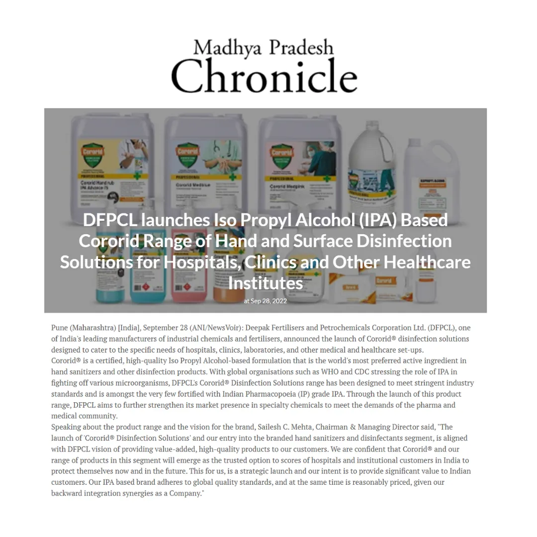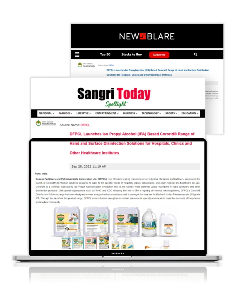 Deepak Fertilisers and Petrochemicals Corporation Ltd. (DFPCL) is one of India’s leading producers of industrial chemicals, with a 40-year legacy. Leveraging its position as India’s largest manufacturer of Isopropyl Alcohol (IPA), DFPCL launched Cororid®, a hospital-grade disinfectant brand, to provide “Indian Pharmacopoeia” grade protection to healthcare institutions.